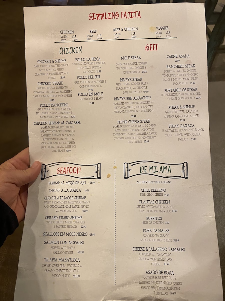Marinated steak cooked to order, served with plantains, black beans and black mole topped with queso fresco.